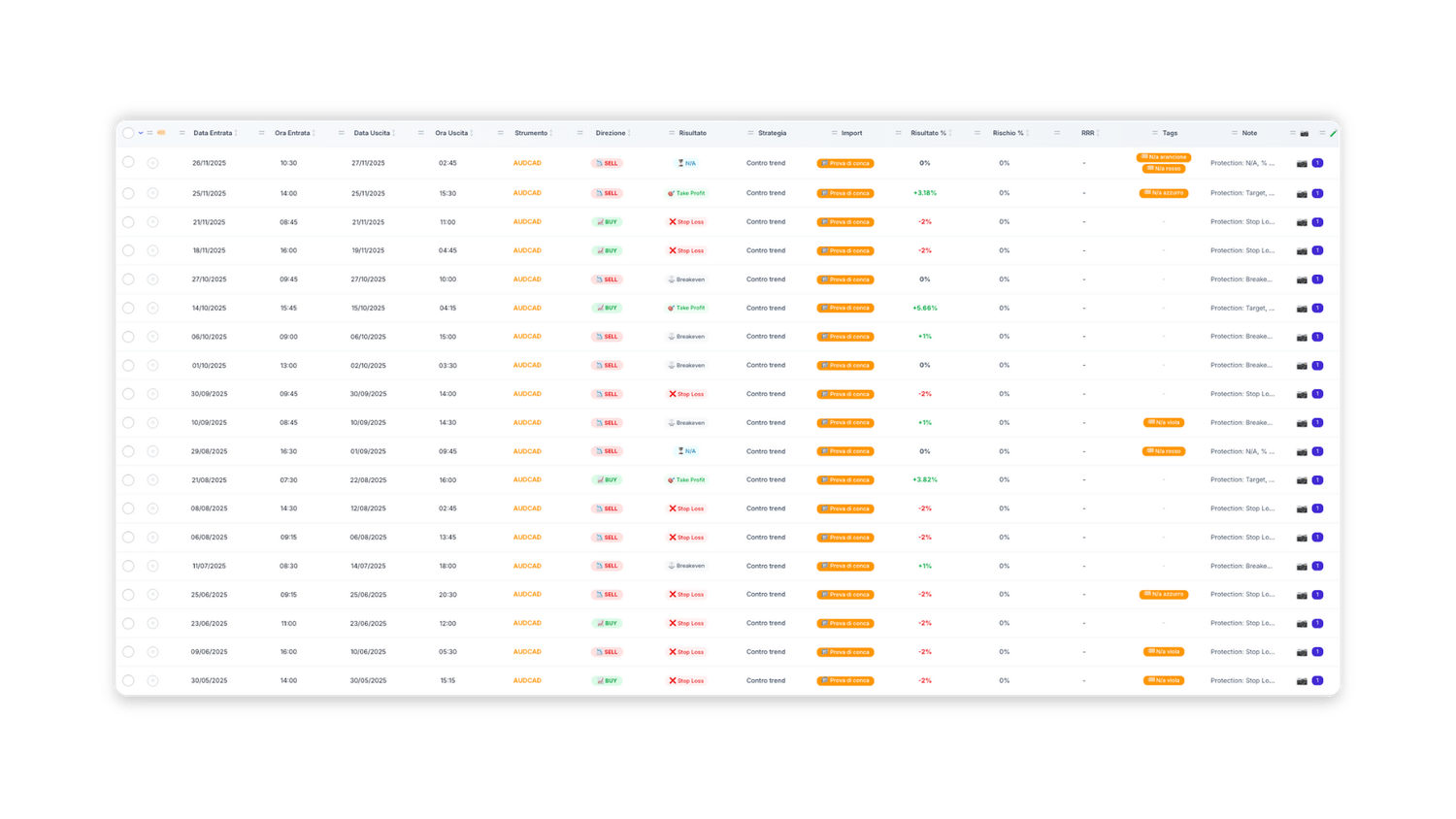 Ogni trade ha la sua struttura (Risultato, strategia, rischio, RR, tag, note…)